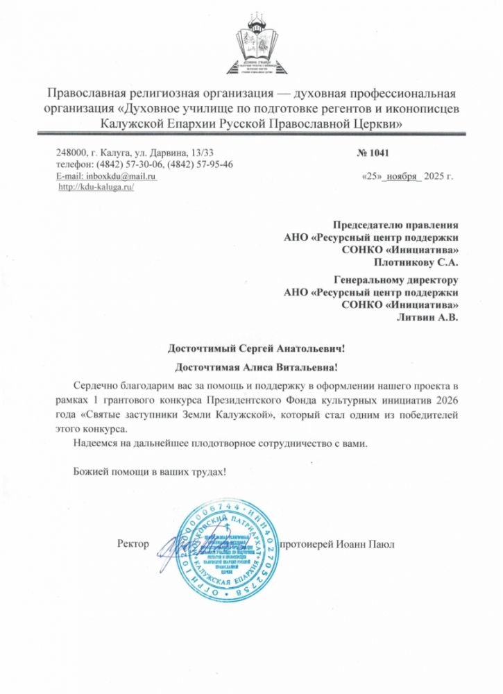 Православная Религиозная Организация - Духовная Профессиональная Образовательная Организация "Духовное Училище по Подготовке Регентов и Иконописцев Калужской Епархии Русской Правослваной Церкви" стала победителем конкурса Президентского фонда культурных инициатив