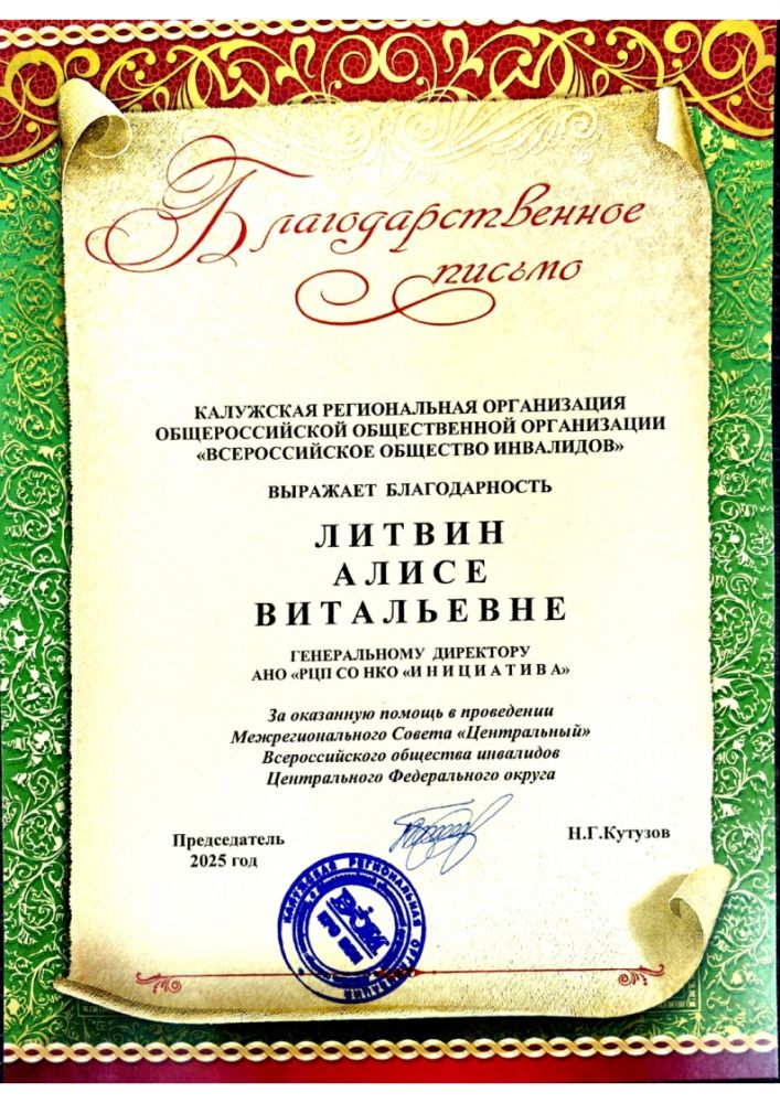 Наша организация получила благодарность за помощь в организации мероприятия от председателя Калужской областной организации ВОИ - Кутузова Николая Григорьевича